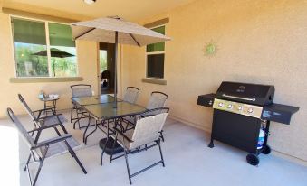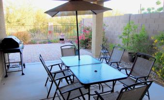 With 3 beds (1 King and 2 Queens), 2 1/2 bath and a den with LazyBoy, this property will easily accommodate 6 people. Large, fully equipped, granite, kitchen, fully furnished. Smart TV hooked up to Roku, outside seating for 8 with grill and Chiminea. Custom tile and carpet. Double sinks in both bathrooms. Walk in shower and soaking tub in Master Bath.