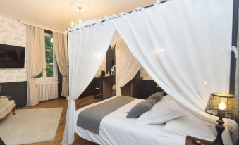 Derrière la magnifique façade, tout n’est que raffinement : meubles chinés, parquet ancien, cheminées, tapisseries, lits à baldaquin, le tout avec le confort et les prestations attendus. Dîner aux chandelles et petit déjeuner exquis ! Les propriétaires, passionnés, ont à cœur d’offrir le meilleur à leurs hôtes !