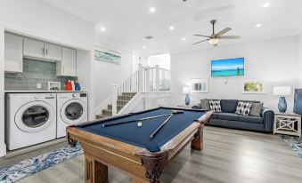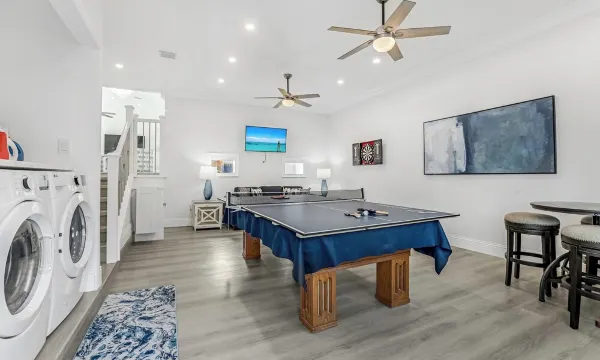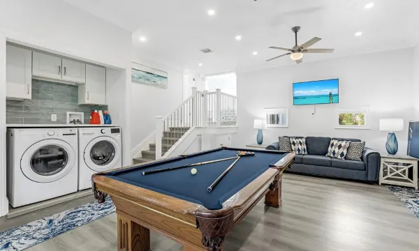 Adjacent to our laundry area is our beautiful recreation room with a custom designed regulation sized pool table, dart board, pub table with 3 stools, a 50 inch Samsung Smart TV and a queen sized sleeper sofa. The pool table also has a convertible top that allows it to be transformed into a regulation ping pong table. Next to our recreation room, is another full bathroom with a glass enclosed Italian marble shower.