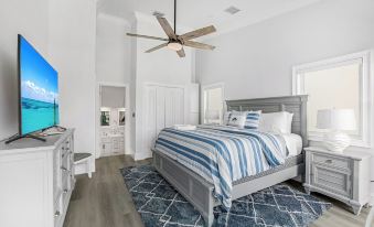 On the main level, the large master bedroom is appointed with a king sized luxury bed, a 65 inch Samsung Smart TV and 700 thread count Egyptian cotton sheets. We also have plentiful new pillows for those that need extras for their sleeping comfort. The floors are covered with a wood look plank and you'll be happy to see that there are two California style closets that will easily accommodate all of your clothing. This bedroom also boasts an opulent ensuite master bathroom, outfitted with a Carrera marble double sink vanity, a stand alone tub and a frameless glass enclosed Italian marble shower. Our master bath is stocked with multiple, thick, ultra soft towels along with a hair dryer. Step through the sliding doors onto our massive 2000 Sq Ft deck for a quick dip in the pool, or to sit under one of our two covered Pergolas. Picture yourself after a fun filled day enjoying a glass of wine while watching the sunset and it will be so. This main Master Suite has a special feature for those families ( like mine ) with small children or Grandchildren and is unique to our vacation home. Within the main Master suite is a private, separate much smaller bedroom with a bunk bed including a trundle bed for the little ones to sleep. This smaller bedroom has a TV, closet and a door to ensure that the little ones stay safely within their safe space while still affording Mom and Dad the privacy and peace of mind that they need for a restful vacation at Journey's End.