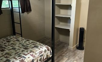 The master bedroom has a queen bed, nightstand, fan and closet space. The second bedroom has a full over full bunkbed, fan and closet space. The living/dining area features a queen futon, end table, lamp, 32" Smart TV, table and 4 chairs.