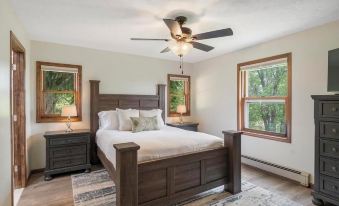 The comfortable living area, spacious kitchen, and dining area open up to a screened-in porch and large backyard. The backyard features an awesome bonfire space, perfect for evening gatherings. Deluxe kitchen appliances, fast Wifi, and a fenced-in yard will make you feel right at home.