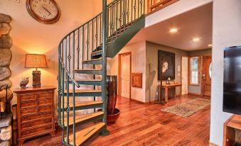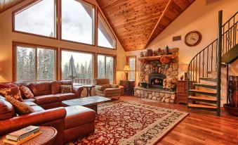 In the Great Room, you’ll find a large wrap-around couch where you can enjoy the look and warmth of the wood stove. The well-equipped kitchen has all the amenities to prepare even the most elaborate meals. After a long day of fun-filled activities, drift into dreamland in one of the beautifully constructed hand-made log beds. Four bathrooms, all with showers and tubs give even large groups enough privacy and convenience. The large outside deck, with a barbecue grill, tables and chairs, overlooks the private pond and front acreage. Appreciate the enchanting ‘old growth' oak trees, giant sequoias and ponderosa pines. During the summer months, take a dip in the fenced-in pool with a picture perfect waterfall. Unwind in the 8 person jetted hot tub all year long. For more entertainment, there is a basketball court and a Smart TV that you can stream Netflix, Hulu or Amazon Prime (use your own accounts or feel free to use our Netflix account).