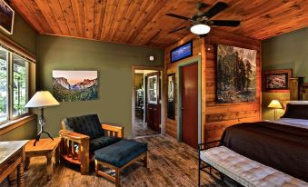 Inside the Cottage the 1 bedroom is appointed with things related to the ranch and Yosemite, and a Queen size bed w/ linens, blankets, comforter, futon chair/bed and ceiling fans.