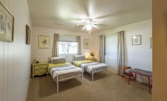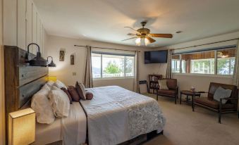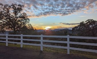 The property includes two free-standing rentals (Hilltop Manor and a smaller building called Treetop Villa) about 30 feet away from one another. The property also includes a free-standing studio where the property supervisor lives and is available to support with any technical or emergency needs. A hundred yards away is an outbuilding that occasionally hosts exercise classes that are available to guests. Otherwise, there are no neighbors in sight and no one else on the 100-acre property, though the town of Mariposa is only a 5 minute drive away!