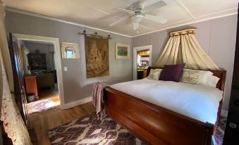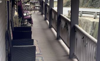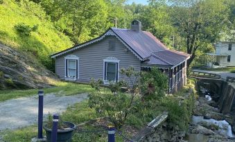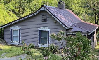 Plum Crooked has been fully restored while retaining it’s original 1930s charm. A rediscovered treasure, everyone in town knows and loves the one and only purple house on Main Street in Marshall. If you are looking for something a little different, our enchanting Poet’s Cottage fits the bill. A covered wraparound porch offers a peaceful respite with rocking chairs, outdoor wicker seating and a bistro set to enjoy the rushing creek just below. Nestled against the mountain we call Ibsen’s Knoll, the cottage has been transformed into a haven of inspiration and restful cozy comfort. A perfect blend of in-town convenience coupled with the dramatic setting at the base of the mountain, Plum Crooked is a perfect choice if you are looking for a Blue Ridge getaway which is not secluded or remote. Main Street in Marshall follows along the French Broad River and then bends uphill past the old church. Plum is nestled across the creek that feeds down to the river. It’s location just at the edge of town is easy to find and super convenient to everything the area has to offer.