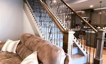 The master suite is pure indulgence — a spa-like sanctuary with a custom walk-in shower featuring dual shower heads and a rain head, a freestanding soaking tub, and a double vanity designed for comfort and luxury. Upstairs, a second bathroom with a custom-tiled tub/shower combo and oversized vanity awaits, while a convenient half-bath is located downstairs for guests. We’ve stocked every bathroom with essentials like plush towels, hair dryers, toiletries, and more — because you deserve to travel light.