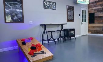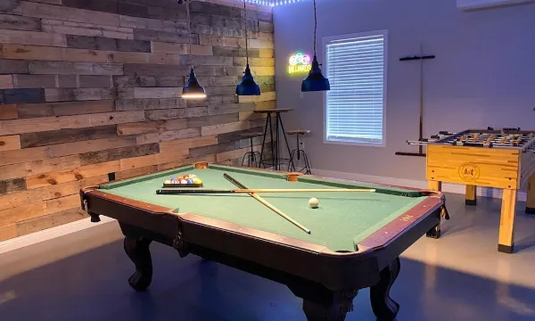 When you're ready to play, head to the aesthetically designed game room, where you'll find a pool table, foosball, lighted cornhole set, chess table, shuffleboard, and even arcade machines in the bunk room — endless entertainment for all ages!