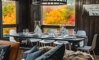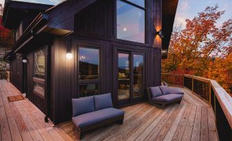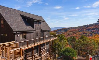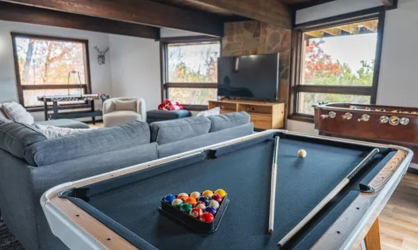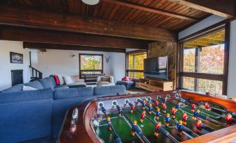 Enjoy time with family and friends in a modern rustic cabin with mountain views or in front of the gas fireplace in a large family room with over 25 foot A-frame windows capturing the view of the ski slopes, the Kettle, and the Blue Ridge Mountains.