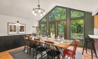 - Dining area with space for 10 at the main table. Additional seating available right next to the table at the kitchen counter (3 stools) and eat-in bar in the kitchen (4 seats)