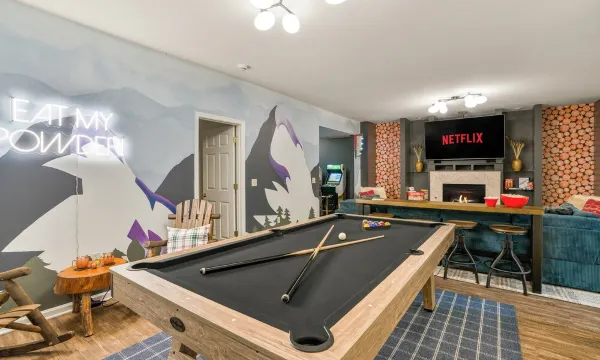 - Additional living room with big screen smart TV, massive sectional couch, and pool table, and plenty of board games