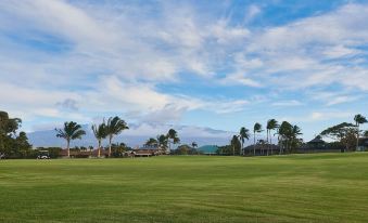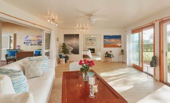 The L-shaped lanai leads seamlessly to the kitchen, dining room, and a cozy great room with expansive golf course views. The home also includes a central relaxation or meditation space—perfect for unwinding after a day of adventure on Maui. Inside, the fully equipped kitchen and spacious dining area are perfect for meals with loved ones. The great room offers expansive views of the golf course, while a separate relaxation room provides a quiet space to unwind. Additional conveniences include a laundry area and a private outdoor shower, perfect for rinsing off after a day at the beach. The layout ensures both privacy and a natural flow, making it perfect for families, couples, or groups seeking a serene retreat.
