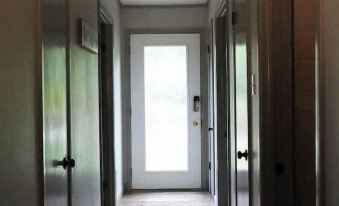 As you enter through the front door you will enter into a hallway, to the left you will see one of our two bathrooms directly to your left and a bedroom with bunkbeds on your right. As you walk down the hall you will see access to downstairs on your left and another bedroom with a full bed to your right. Our kitchen, dining room, and living room is an open area with sliding glass doors leading to the wraparound deck. This dining table seats 6. Downstairs, the living room, dining room (also seats 6) and the half kitchen is also open concept. The door left of the sink downstairs leads to the laundry room. Also downstairs you will find our largest bedroom with a beautiful lake view, two queen beds, two closets, and a private bathroom. The Downstairs walks out to the lake where there is private dock access and a large shaded back yard equipped with a fire pit and corn hole.