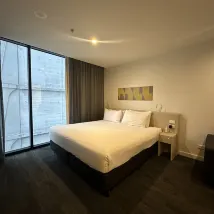 Расположенный почти в самом центре Мельбурна, в районе с безупречным уровнем отделки, он легко доступен куда угодно, но при этом находится недалеко от Чайнатауна, что делает его довольно хаотичным. Из окна открывается вид на стену соседнего высотного здания, из-за чего в номере весь день темно. Удобства хорошо продуманы, включая кухонные принадлежности и доступ к прачечной, что особенно важно для гостей, проживающих долгое время. Уборка номеров и заправка кроватей доступны только до 10:00 на стойке регистрации, но по утрам там всегда многолюдно.