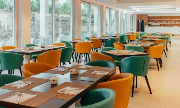 Nice clean and modern rooms, can’t fault that, and the pool area is nice. Good size outdoor space with table and chairs and clothes airer. Nice we come in reception when we arrived, but that is all the positives. The snack bar menu only served for a limited time st lunch. The food was terrible. No more than 1 star quality. The staff are extremely rude and unhelpful. Music blaring from the pool bar with guest singing loudly and dancing which was encouraged by the bar staff. Not all of us want to listen to blaring music while relaxing round the pool The mini bar in the room was empty bar one bottle of water between 2?. 3 eros to get your pool towel washed. Then we came to dinner. What a disaster and a complete rip off at €30 each. We did not want to hop back in the car so decided to have it. Disgusting. the salad bar was a bowl of chopped bitter tomatoes, corn and iceberg lettuce, one of the pastas was like eating a can of spaghetti hoops. The main meal of tempura cod was slightly better, although the sauce way to rich. Puddings were. ot geat. Ice cream had bits of ice in it. All in all really bad, and the waiters not nice. The woman behind the pool bar was really sharp too.
