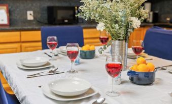 You’ll have access to quality cookware, dinnerware, wine glasses, and utensils along with a coffee maker to get your day started right and all the cooking essentials you would need right at your fingertips.