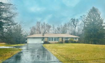 Step back into time in this cozy and charming 1959 mid-century-styled ranch house. Set on a sprawling 5 acres with a beautiful creek in the backyard, enjoy the fresh country air on the back porch and the wildlife such as deer and turkeys that frequent the property. Located only 7 miles from the Shenango River Lake/Dam and 12 miles from Chestnut Run Swim Beach. This is a peaceful and quiet property perfect for any stay. There is an area for a campfire in the backyard. Ring outdoor security camera located outside garage door. About pets:Pets allowed: dogs and cats (limit 1 total).About checkOut:Check out before 11:00 AM.About children:Children allowed: ages 0-17.About customRules:Do not park in the yard and do not drive through the yard..Smoking allowed outside of the home only.,Wash and put away your dishes..About checkIn:Check in after 3:00 PM.About smoking:Smoking is not permitted.About minBookingAge:Minimum age to rent: 18.About events:No events allowed.