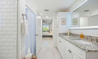 - 2 bedrooms, 2 baths: King-size master suite with walk-in closet, desk space, and spa-like ensuite; second bedroom with queen bed and adjacent bath.