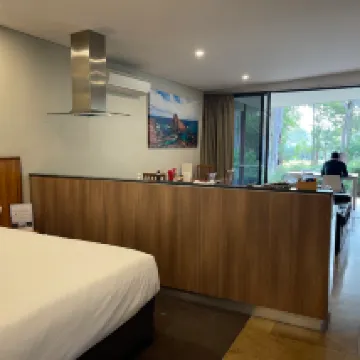 Great place to stay if you’re looking for a quiet, peaceful retreat to rejuvenate and relax. The room is big with a huge bathroom and a great jacuzzi bathtub. The resort does not have any restaurants but has a fully equipped kitchen with all basic appliances and cooking utensils in our room. Also comes with cooking oil, salt and pepper, washing liquid and detergent with washing machine and dryer. We certainly made good use of the kitchen to cook our dinner and breakfast. The king size bed is big and very comfortable. Pillows are a bit too hard though.