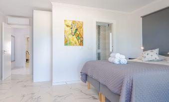 If we start from outside; You will find the gate where you can park up to 3 cars outside at the gravel road. When you walk inside, you will find orange threes on the right side, the 6 bedroom villa on the left side + the separate smaller house in front of you with 1 bedroom and private kitchenette. The villa is divided on one floor with an over-deck suntan terrace where you find sun-beds and stunning views over the coast. At the terrace space you will find everything from a just finished gas and charcoal BBQ corner, pool table, ping pong game & private heated swimmingpool. Easy said, everything needed to enjoy a vacation!