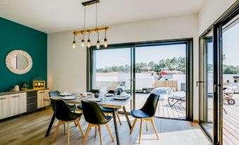 Beautiful single-family house "Palot 63", built in 2020. In the resort 600 m from the centre of Mimizan Plage, 1 km from the sea, 8 km from the lake. Parking (for 2 cars). Shop, grocery 600 m, shopping centre 6 km, restaurant, bakery, bicycle rental, bus stop 600 m, sandy beach "La Garluche" 600 m, indoor swimming pool 7 km, bathing lake "Aureilhan" 9 km. Golf course (9 hole) 7 km, surf school 600 m, riding stable 9 km, cycle lane 200 m. Nearby attractions: skate parc 400 m, Au Paradis Du Papillon 48 km, Eco Musée de la Marquèze 47 km, Parc Aventure Accrobranche 7 km. 4-room house 78 m2 on 3 levels on 1st floor. Comfortable and modern furnishings: living/dining room with TV and international TV channels (flat screen), air conditioning and electric shutters. Exit to the terrace. Upper floor: kitchen (oven, dishwasher, 1 induction hot plates, 3 gas rings, toaster, kettle, microwave, freezer, electric coffee machine, Capsules for coffee machine (Nespresso) extra) with air conditioning. Exit to the terrace. Shower, sep. WC. Air-conditioning. 2nd upper floor: 1 room with 1 french bed (160 cm, length 200 cm), shower/WC. Exit to the terrace. 1 room with 1 x 2 bunk beds (90 cm, length 190 cm), 1 french bed (160 cm, length 200 cm). Wooden floors. 2 terraces 40 m2. Terrace furniture, barbecue, deck chairs. Facilities: washing machine, iron. Internet (WiFi, free). Parking (2 cars). Please note: non-smoking house. Maximum 1 pet/ dog allowed. Smoke alarm. Please note : bunk beds and french bed are separated by a glass door, between the living room and the kitchen 6 steps, between the kitchen and the bedrooms 6 steps. Works in progress in the housing estate.. FR3420.226.1