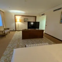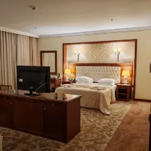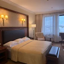 Жили в номере Люкс на 7 этаже. Прилетели мы часов в 12, были свободные номера и нас заселили просто мгновенно. В номере чистота, постельное белье и полотенца просто белоснежные. В номере и халаты и тапочки и всякие мелочи. Начиная от станка и зубной щетки, заканчивая набором для шитья. Расположен очень удобно, в номере очень тихо, соседей не слышали. Завтраки очень разнообразные, сытные, вкусные. Да, видно, что мебель уже под уставшая и ковролин, но в общем все очень хорошо.