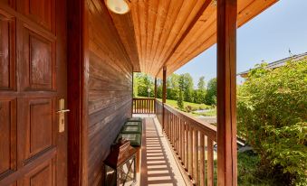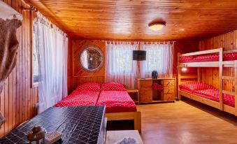 Comfortable bungalow detached. 7 houses in the resort. Outside the resort, in a quiet, sunny position, 50 m from the edge of the forest, 2 km from the skiing area. For shared use: natural state property, lawn for sunbathing, swimming pool (seasonal availability: 26.Jun. - 03.Sep.). Shower/WC in the pool area, table tennis, boccia, badminton, beach volleyball, barbecue, fireplace. Private: patio. In the complex: WiFi, billiard table, storage room for bicycles, sun terrace, storage room for skis. Parking at the house. E-charging station. Grocery 1.5 km, shopping centre 6 km, restaurant 5.5 km, bus stop "Mladé Buky" 1.5 km, railway station "Mladé Buky" 1.5 km, indoor swimming pool 10 km. Golf course (18 hole) 4 km, riding stable 3.5 km, walking paths from the house, cycle lane 50 m, ski rental 2.5 km, ski bus stop 50 m, ski school 2.5 km, children's ski school 2.5 km, sled run 2 km, cross country ski track 500 m, children's playground 50 m. Nearby attractions: zábavní park Baldův svět, 2.5 km, Rozhledna Eliška, tvrz Stachelberg 9 km, Stezka Korunami stromů Janské Lázně 10 km, Lanovka na Sněžku, Pec pod Sněžkou 18 km, Zoo Dvůr Králové, Adršpach 28 km, Vyhlídkové lety Vrchlabí, Kuks 30 km. Well-known ski regions can easily be reached: Mladé Buky 2 km, Janské Lázně 9 km, Černý Důl, Pec-Černá hora 15 km. Hiking paths: Krkonošský národní park. Please note: the photograph shows a typical example. "Lesní plovárna B3", 1-room bungalow. Comfortable furnishings: living/sleeping room with 1 x 2 bunk beds, 1 double bed, Scandinavian wood stove, dining table and TV (flat screen). Kitchenette (2 hot plates, toaster, kettle, microwave, electric coffee machine, Capsules for coffee machine (Tchibo)). Shower/WC. Electric heating, wood heating. Terrace. Terrace furniture, barbecue (portable), deck chairs. Facilities: Internet (WiFi, free). Please note: suitable for families. Non-smoking house. 1 small pet/ dog allowed.