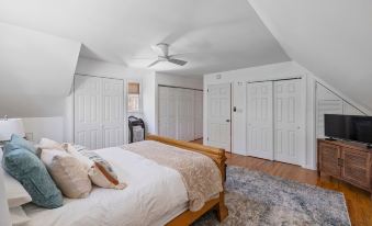 Soft, cozy queen bed with elegant hardwood frame. Airy, soothing palettes with natural light. Take advantage of plentiful closet space. Unwind in the evenings by streaming your favorite Smart TV show.