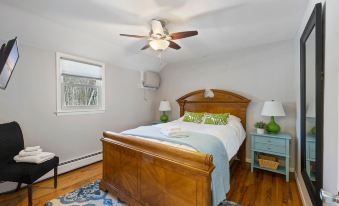 Charming, rustic room with cozy full bed and nightstand, unique area rug, mirror. Functional work desk for studying, reading, or remote work.