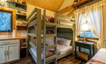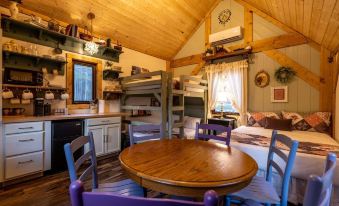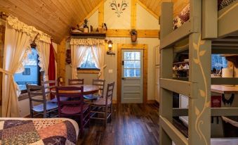 This rental is 225 sq feet with an open floor plan (studio style) with a Queen bed and full over full bunk bed. These are located at our Sherwood Forest area of the property which is close to the creek.