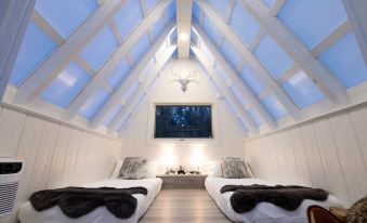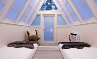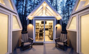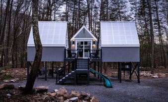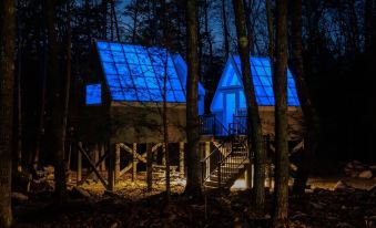 Reminiscent of an illuminated floating lantern, our Glo Haus offers elevated glamping among the trees. Our Glo Pod consists of three pods: two sleeping pods and one gathering pod. The two sleeping pods comfortably sleep up to two people in Twin XL to King conversion beds. We have included unique features such as a slide exit for kids, a swing, and Aurora Night Sky projectors for a special light show. This will be a truly unique experience!About pets:No pets allowed.About checkOut:Check out before 11:00 AM.About children:Children allowed: ages 0-17.About checkIn:Check in after 4:00 PM.About smoking:Smoking is not permitted.About events:No events allowed.