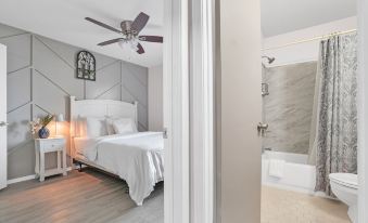 - Modern stylish bathroom with floor to ceiling tiles and Tub/Shower combo