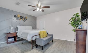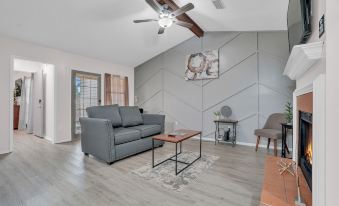 A combination of vinyl plank floors, high ceilings, and central air-conditioning offers added comfort and beauty throughout the home. Enjoy formal lounge and dining complemented by an immediately inviting wood-burning fireplace. Outside you will find off-street /private parking and a beautiful landscape paved patio with a fire pit and seating area.