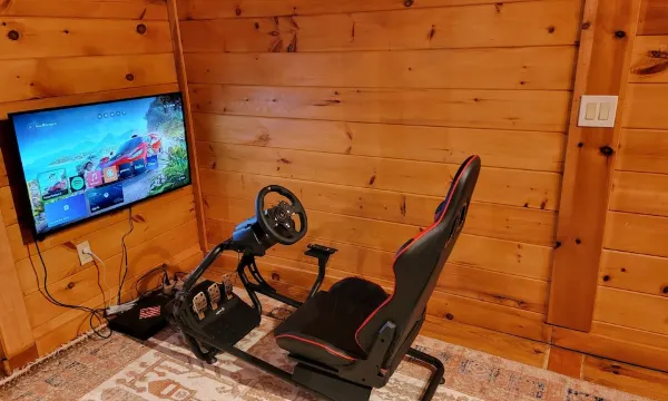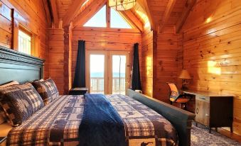 The lower level of the cabin is home to the third bedroom, providing an entirely different experience with its California king-sized bed. This multifunctional space is designed for entertainment, recreation, and exercise, making it an ideal retreat for guests of all ages. This bedroom offers a sense of privacy and seclusion. It is perfect for those that need a comfortable and dark room to fall asleep. Adjacent to the room, there's a versatile daybed that can be pulled out to accommodate two people comfortably when needed.