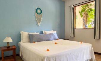 A pousada fica no começo da terceira praia, então não está no meio da muvuca que é a segunda praia, o que foi ótimo pra gente. A cabana que ficamos é muito aconchegante, o banheiro nos surpreendeu por ser mais moderno, e muito limpo. O ar condicionado funciona muito bem, e de noite dormimos super tranquilos, sem barulho de música nem pessoas! E sem falar que saindo da cabana, é tudo árvore frutíferas e flores e plantas. O café da manhã foi bom o suficiente pra gente e com uma vista pro mar! Eu realmente voltaria e recomendaria pra qualquer um!