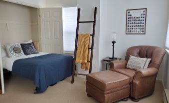 On the third level, you will walk into a very spacious master bedroom with a queen Tempur-pedic bed and large windows to enjoy the views. One of the closets in this bedroom holds a full-sized Murphy bed that can be pulled down and set up for an additional sleeping area. This space also contains a comfortable lounging chair and television. Adjacent to the bedroom is a full bathroom.