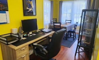 The dining room is just off the other side of the living room with seating for 6 people. Between the dining room and the kitchen is a small desk for you to use if you need. I also have a wireless HP printer that you can use to print if needed.