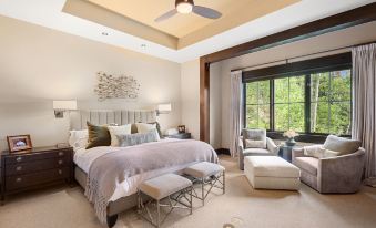 The main living area boasts VAULTED CEILINGS, a stone fireplace, and expansive windows that flood the home with natural light while framing panoramic mountain views. Sophisticated furnishings and elegant details make this space ideal for gathering with family and friends after a day of adventure.
