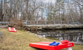 You can lounge on a daybed over the stream, or kick your feet up on one of the many outdoor seating areas