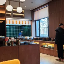 В помещении очень тепло, персонал приветливый и внимательный, особенно женщина, которая готовит на завтрак вонтоны и лапшу. Она с энтузиазмом напоминает каждому клиенту, какие приправы нужно добавить 👍.