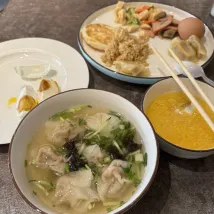 Есть также много видов завтрака. Тушеные вонтоны и жареные пельмени свежеприготовленные.