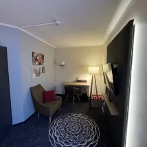 Чудесный вежливый персонал на ресепшн, слышимость между номером и коридором есть, но за счет еще одной двери из комнаты в прихожую, можно обеспечить тишину. Находится возле вокзала, поэтому вокруг антураж соответствующий .