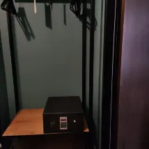 Есть сейф, холодильник и чайник с пакетиками чая и кофе.