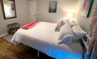 Sunnyside Villa is Unit B in this charming duplex. In the spacious family room, guests will enjoy a 65" Smart TV (Netflix and Prime included), queen sleeper sofa, welcoming dining area, and desk for remote working. For an evening of family fun, there is an entertainment cabinet stocked with games, puzzles, books, and playing cards. The fully-equipped kitchen and convenient coffee bar have everything you need to create delicious meals. The front bedroom features a king bed with luxury linens, a Smart TV and an ensuite bathroom. The second bedroom includes a king bed with luxury linens and another full bathroom adjacent to the room. A convenient utility area with a washer/dryer, iron & ironing board is ready for use. Multiple sources of mood lighting will help to create the most desirable atmosphere: lighted mirrors and nightstands, colorful lights under the kitchen cabinets, dimmable track lights, 3-way bulbs in table lamps and night lights in all rooms. Additional features include multi-plug/USB charging ports in every room for rapid and simultaneous charging, modern ceiling fans, & plenty of storage space for clothing & luggage. Step outside to the patio area where a gas Weber grill and outdoor dining for four awaits. Park your boat (up to 21 ft) in the fenced-in back yard. This property is the ideal place to call home while away with loved ones!