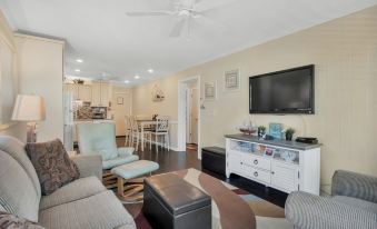 Family room: Enjoy TV on the large flat screen. Access to balcony via sliding glass doors.