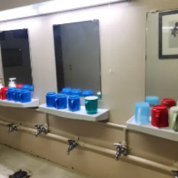 #Из крана с горячей водой в общественном туалете может течь только кипяток, поэтому вам нужно подготовить таз с холодной водой.