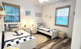 • Bedroom 2: Two twin beds, sharing a bathroom with Bedroom 3.