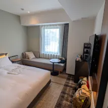Отель удобно расположен, недалеко от станции Асахибаси, примерно в 500 метрах. Внизу есть магазины Lawson и 7-Eleven. Размер номера приемлемый, учитывая цену, все условия соответствуют ожиданиям. Персонал на стойке регистрации дружелюбный, они приняли мой багаж, отправленный из аэропорта.