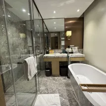 Ресепшн, обслуживание номеров, ресторан. Расположение очень удобное. Станция метро находится почти напротив отеля. Одна минута ходьбы. Рядом находится огромный торговый центр MIXC. Или выйдите из отеля, поверните направо и на следующей улице направо. Вы найдете множество магазинов, ресторанов и несколько музыкальных баров. И кинотеатр IMAX. Номер: У нас был прекрасный вид, номер и ванная были довольно просторными. Нам также понравился Roboter, который приносил вам напитки и еду. И последнее, но не менее важное, заслуживают упоминания рестораны: Нам очень понравился Dim Sum, и однажды вечером мы ужинали в главном ресторане с местными друзьями. Он стоил своих денег, но это было восхитительно! Почти невозможно превзойти!