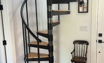 The staircase leads to a front parlor with two low seats that convert into futon-type beds. An antique cabinet holds more books and games. The king bedroom has a dresser, side tables, lamps, and a nice closet. The room has an HVAC system.